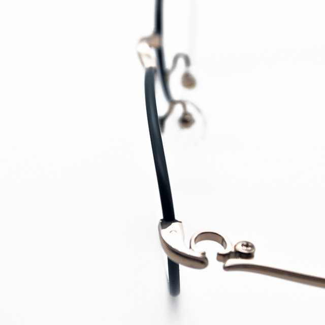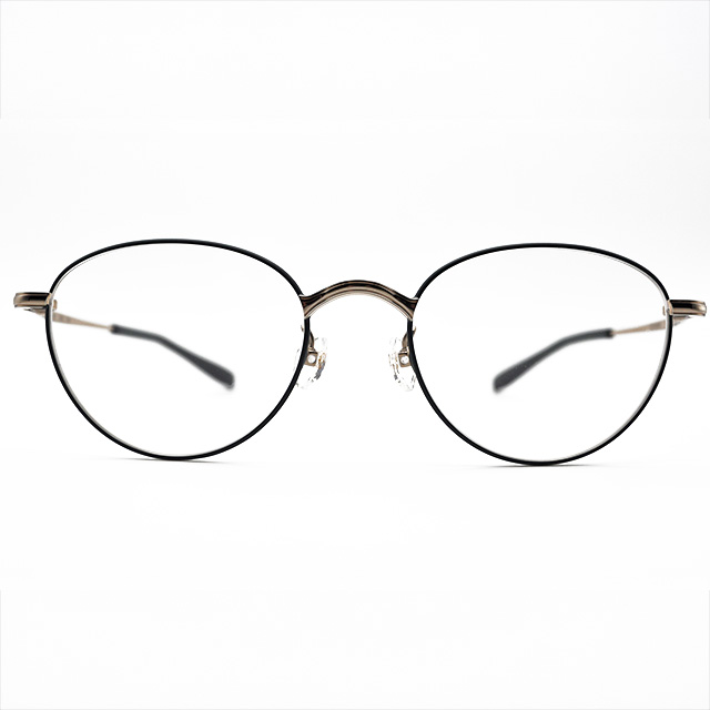 優しげなレンズシェイプと上品なゴールドフレームをグリーンの縁取りが質感高くまとめたフォーナインズのメタルフレーム。